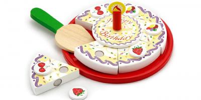 Handbemalter Geburtstagskuchen aus Holz. Belegen Sie den Kuchen mit verschiedenen Früchten.