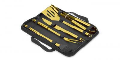 Mit diesem praktischen Grillset verfügen Sie garantiert über die Kunst des Grillens. Es spielt keine Rolle, ob Sie im eigenen Garten grillieren wollen oder unterwegs. Denn in diesem tollen Set ist alles nötige vorhanden. Es enthält eine Grillzange, ein Bratenwender, eine Gabel, ein Messer sowie ein Pinsel. Die goldene Farbe verleiht den Grillutensilien ausserdem das gewisse Etwas.