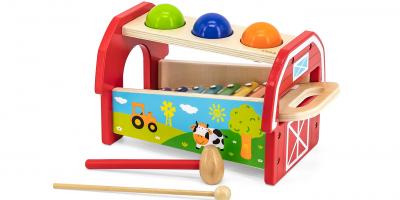 Die Bälle können "duchgeklopf" werden und erzeugen unterschiedliche Töne auf dem Xylophon. Für musikalische Entfaltung kann das Xylophon herausgenommen und separat verwendet werden.