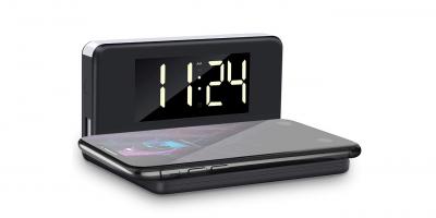 Eine kabellose Ladeuhr mit einer 24-Stunden-Uhr auf dem Display und einem Alarm. Einschliesslich eines USB-Ausgangs für zusätzliche Kabelaufladefunktionalität. Neben dem Kabelaufladegerät enthält die Uhr ein kabelloses Ladegerät und eine LED-Lampe auf der Oberseite zur Beleuchtung des Raumes.
