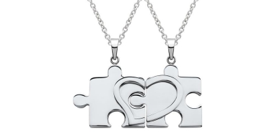Zwei hochwertige Edelstahlketten mit einer Breite von je 1,6 mm. Dazu gehört ein Paar stilvoller Partneranhänger in Form von silbernen Puzzleteilen. Die Anhänger besitzen zusammengenommen eine Breite von ca 60mm. Die Ketten können in den Längen 40, 45 oder 50 cm geliefert werden.