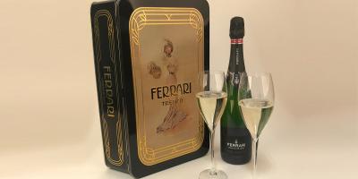 Edles Ferrari-Schaumwein Geschenkset mit einer Flasche Ferrari Maxium - Blanc de blancs brut (7.5dl) und zwei geeichte Trentino Flûte Privé Grand Cru Gläser für den optimalen Genuss. Die Verpackung ist eine elegante Blechbox mit dem Ferrari Trento Retro Design.