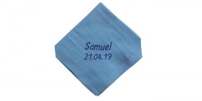 Der Name und das Datum werden dann in Schweizer Handarbeit auf das qualitativ hochstehende Nuscheli gestickt. Die Stickerin wählt die Garnfarbe soweit möglich Ton-in-Ton (hell auf dunkel / dunkel auf hell) und passt die Schrift der Länge des Namens an.
