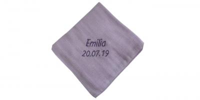 Der Name und das Datum werden dann in Schweizer Handarbeit auf das qualitativ hochstehende Nuscheli gestickt. Die Stickerin wählt die Garnfarbe soweit möglich Ton-in-Ton (hell auf dunkel / dunkel auf hell) und passt die Schrift der Länge des Namens an.
