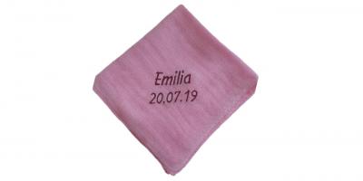 Der Name und das Datum werden dann in Schweizer Handarbeit auf das qualitativ hochstehende Nuscheli gestickt. Die Stickerin wählt die Garnfarbe soweit möglich Ton-in-Ton (hell auf dunkel / dunkel auf hell) und passt die Schrift der Länge des Namens an.