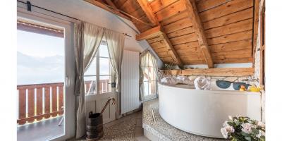 Die Suite Chalet Alpenglut liegt im Dachstock und hat eine private Sauna und ein Whirlpool. Vom Whirlpool und vom Balkon bietet sich eine einmalige Aussicht auf Eiger, Mönch und Jungfrau sowie den wunderschönen Thunersee an. Wieder einmal die Zeit nur zu Zweit zu haben und die Sorgen vergessen, das ist Balsam für die Seele. Das 3-Gang Menü wird am Abend ins Zimmer serviert. Warum nicht das Abendessen mit Sicht auf Eiger, Mönch, Jungfrau, den Thunersee und den Sonnenuntergang geniessen? Etwas später können Sie sich glücklich in das mit Stoff-Rosenblätter dekorierte Bett sinken und sich Zeit fürs Träumen nehmen. Aus dem Hochbett haben Sie eine tollen Blick auf den Thunersee. Am Morgen, nach dem gemütlich Erwachen, wartet schon ein Picknick Korb mit den am Vortag gewünschten Speisen vor der Tür. Dank dem Late Check-out um 13:00 Uhr bleibt nochmals Zeit für die Sonne auf dem Balkon zu geniessen oder die Zeit im Whirlpool oder die Sauna zu verbringen.