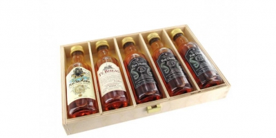 Der elegante Klassiker aus den schottischen Highlands: Whisky Collection 5 Mini Flaschen in personalisierbarer Geschenk-Holz-Kassette.
